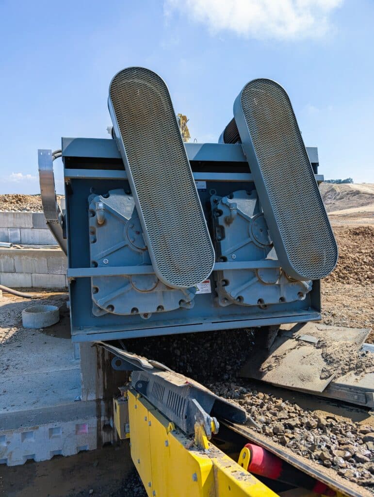 Designed for high-capacity processing, the twin-shaft washer uses dual counter-rotating augers and wash paddles to scrub and separate material efficiently while maintaining throughput. In this installation, the unit is positioned directly under a crusher discharge conveyor, allowing crushed material to be processed immediately without additional handling.